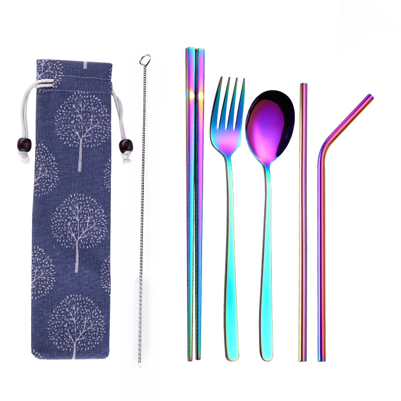 Set 7pcs Sendok Garpu Sumpit Model Sedotan Bahan Besi Dapat Dipakai Ulang Jerami