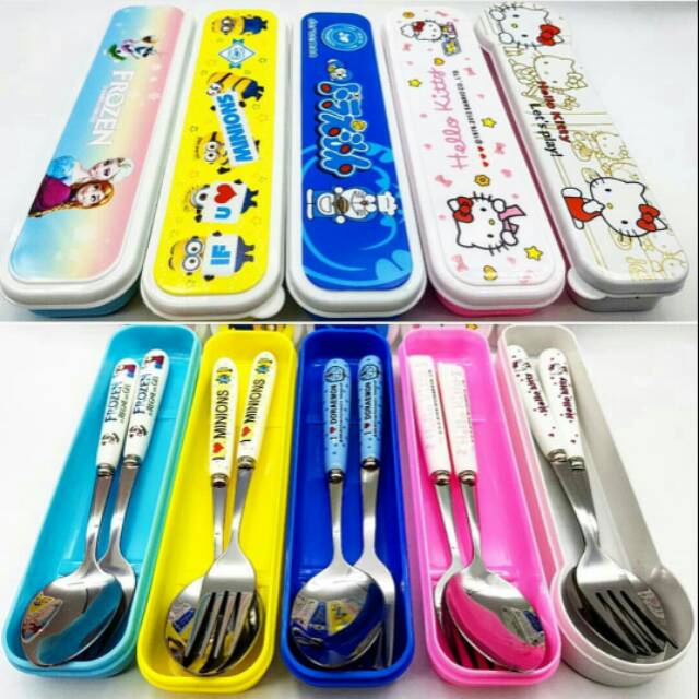Sendok Garpu Set Sendok Garpu Makan Plus Tempat Sendok Garpu Doraemon Frozen Minion